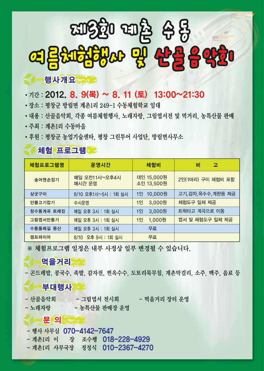 제3회 계촌 수동 여름체험행사 및 산골음악회가 8.9(목) ~ 8.11(토) 계촌1리 수동마을에서 열립니다.