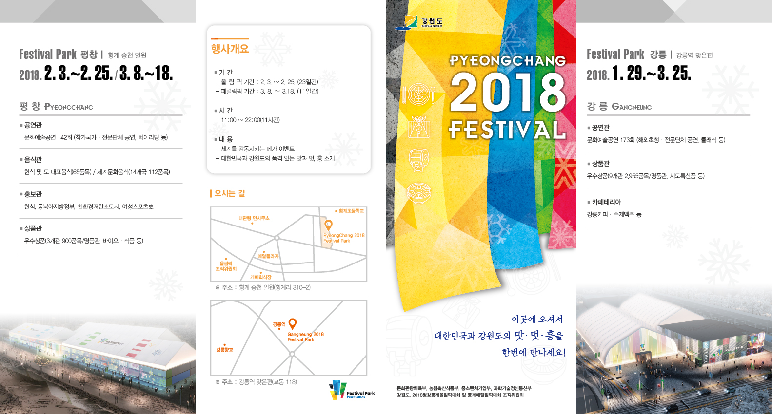 그리고 평창페스티벌 파크(눈꽃축제장 인근) 에서는 다양한 문화예술공연('평창2018페스티벌 ※붙임)이