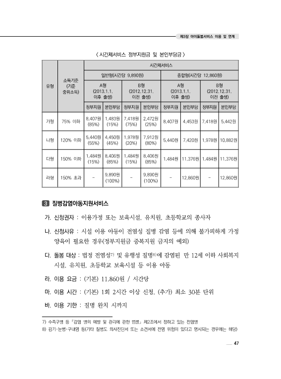 다. (요금예시(시간제 종합형 미취학, 만3개월 이상~만 12세 이하 아동)- 중위소득75% 이하 일 경우 시간당 요금 12,860원 중 정부지원8,407원/ 자부담 4,453원)