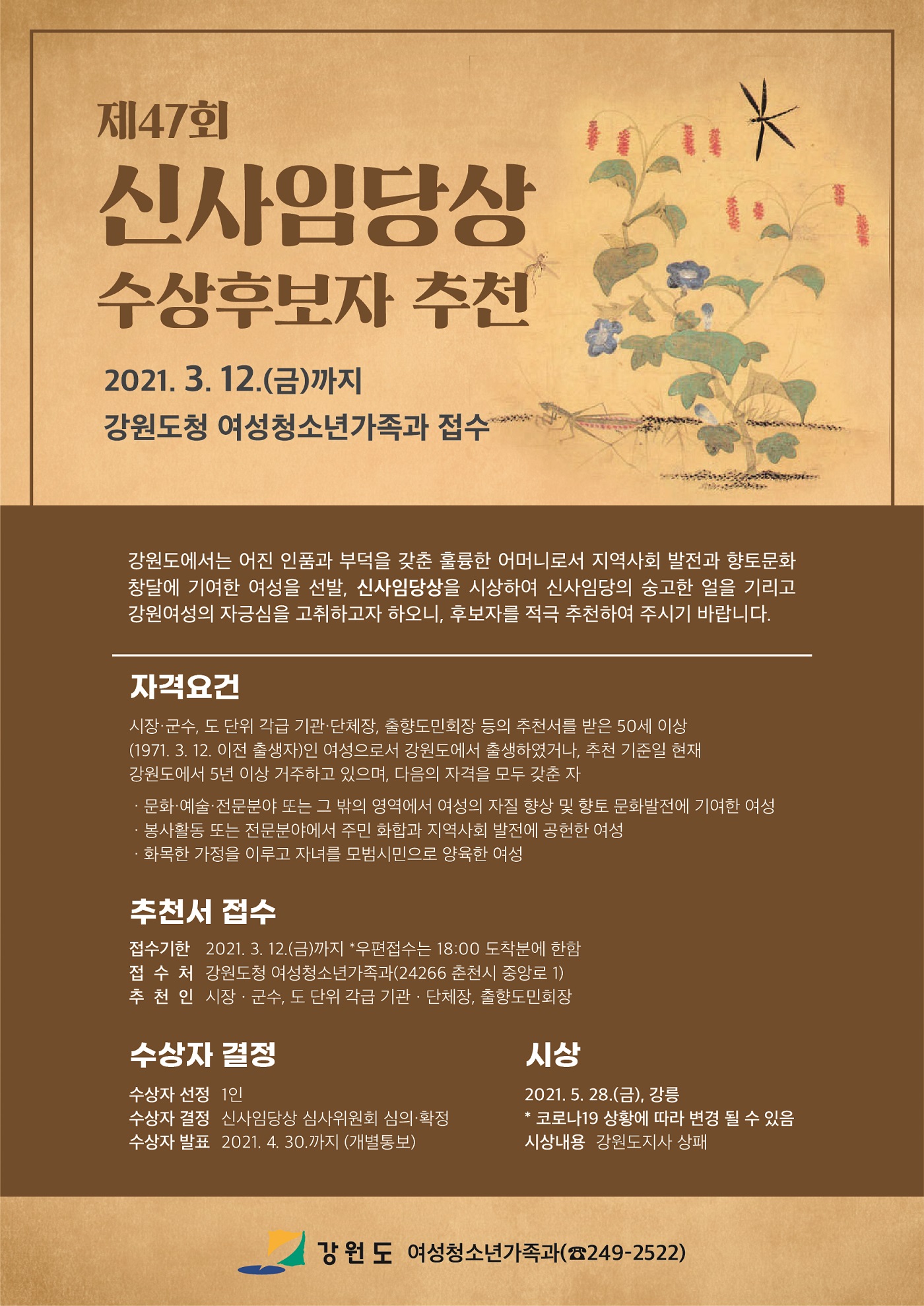 제47회 신사임당상 수상호보자 추천 공고문을 붙임과 같이 안내합니다.