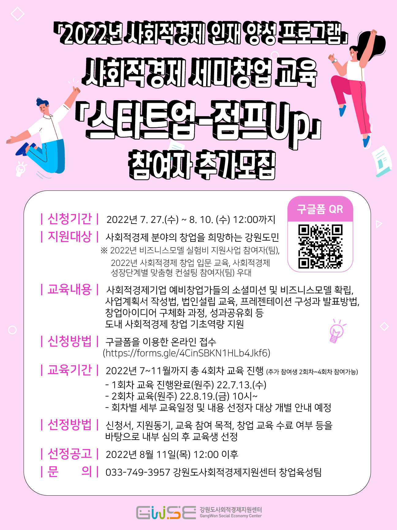2022년 사회적경제 세미창업교육「스타트업-점프Up」교육생 추가모집