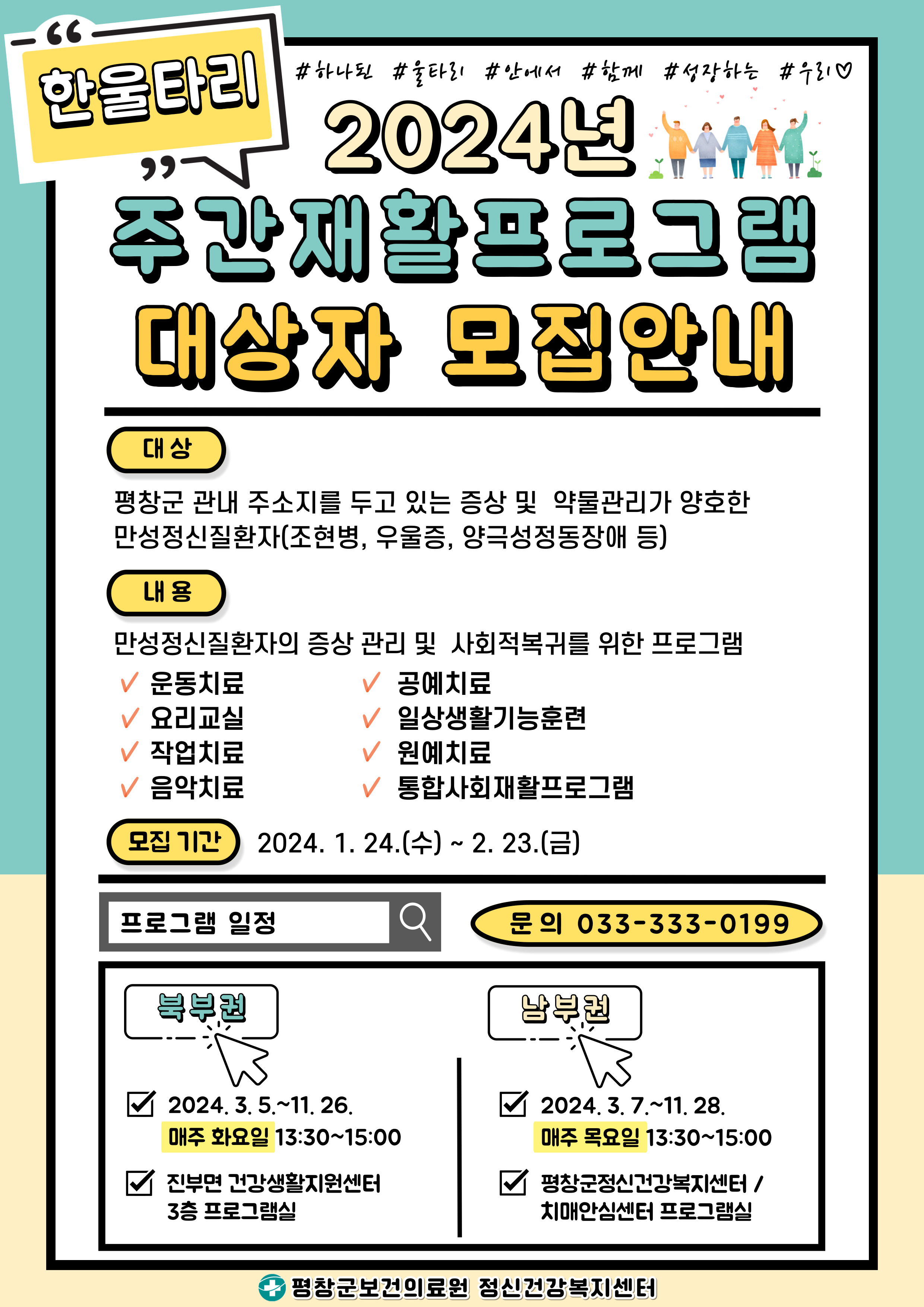 평창군 정신건강복지센터에서 2024년 주간재활프로그램 대상자를 모집합니다.