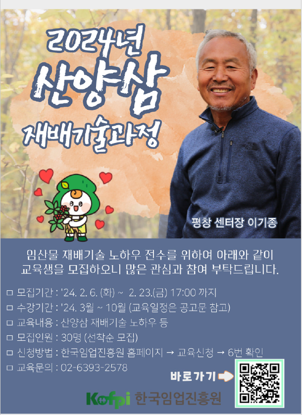 임업인의 역량강화 및 소득증대를 위한 2024년도 산양삼재배기술 교육과정 교육생을 모집하고 있습니다.