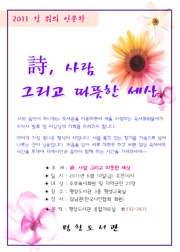 시와 음악이 하나되는 도서관을 이용하면서 책을 사랑하는 독서회원들에게 자작시 발표 및 시감상의 기회를 드리고자 합니다.