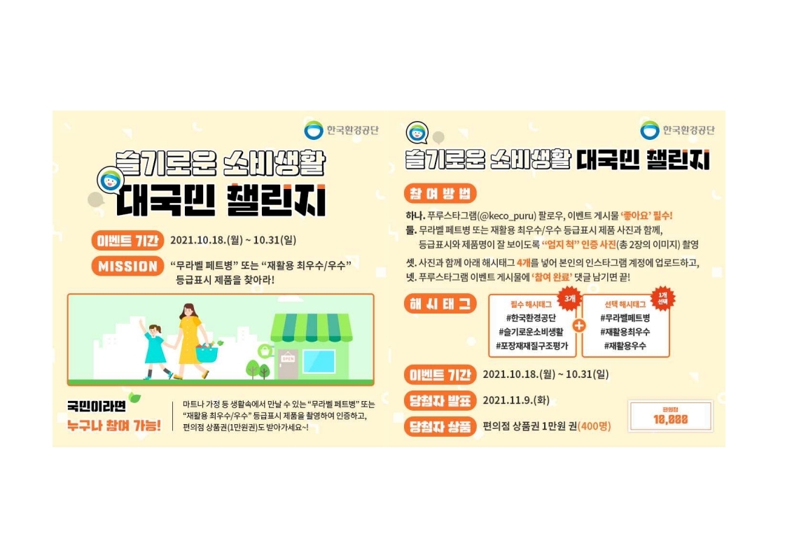 - 챌린지 1 : 마트나 가정 등 생활 속에서 만날 수 있는“무라벨 페트병”또는“재활용 최우수/우수”등급표시 제품을 촬영하여 SNS에 인증