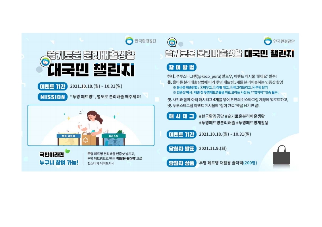 - 챌린지 2 : 올바른 배출 방법에 따라 투명페트병(5개)을 별도 배출하고, 인증샷 촬영 후 SNS에 인증