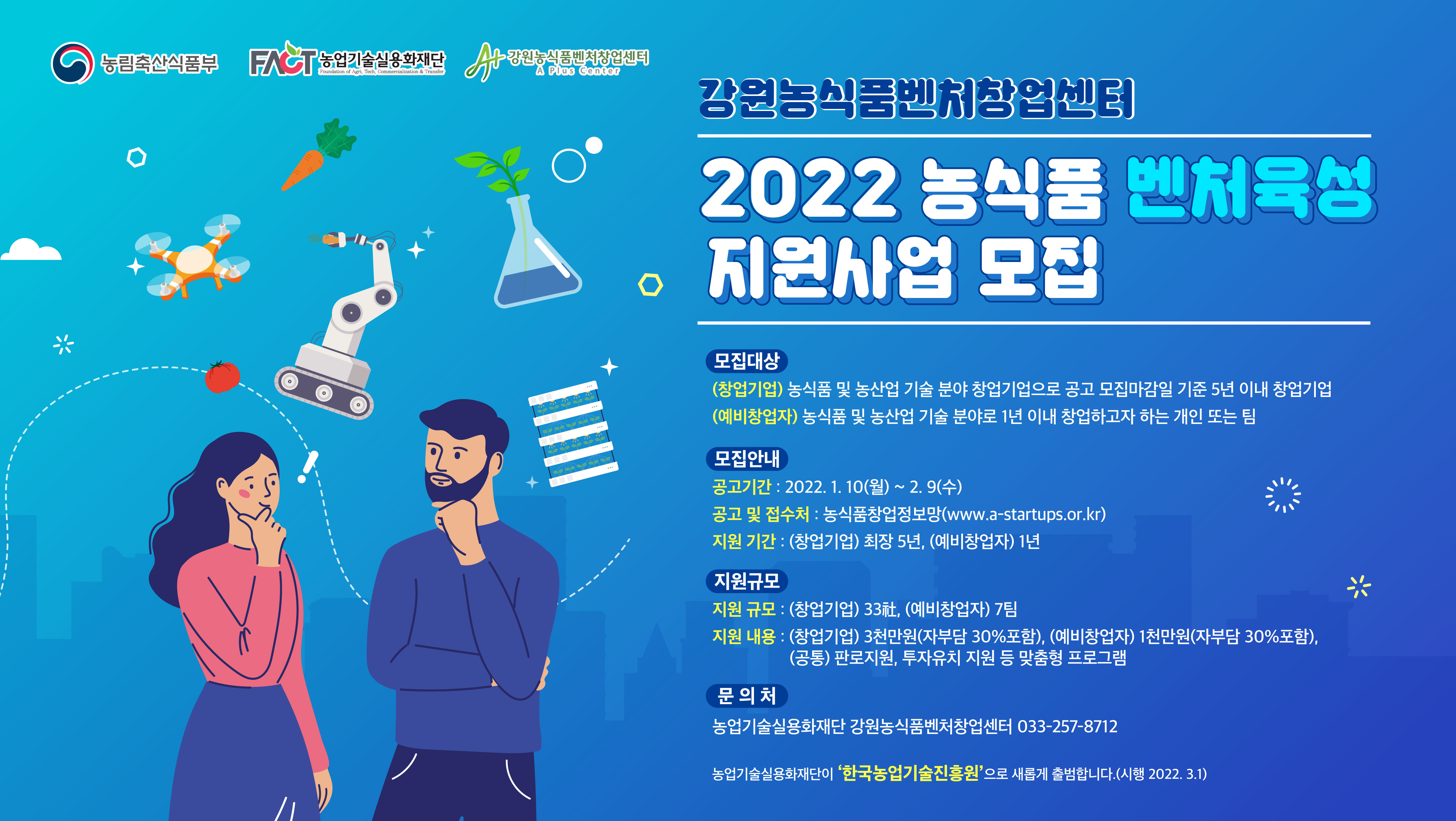 농림축산식품부 및 강원농식품벤처창업센터는 농식품 및 농산업 기술 분야 예비창업자 및 창업기업을 선정하여 「2022년 농식품 벤처육성 지원사업」을 추진하고자 합니다.