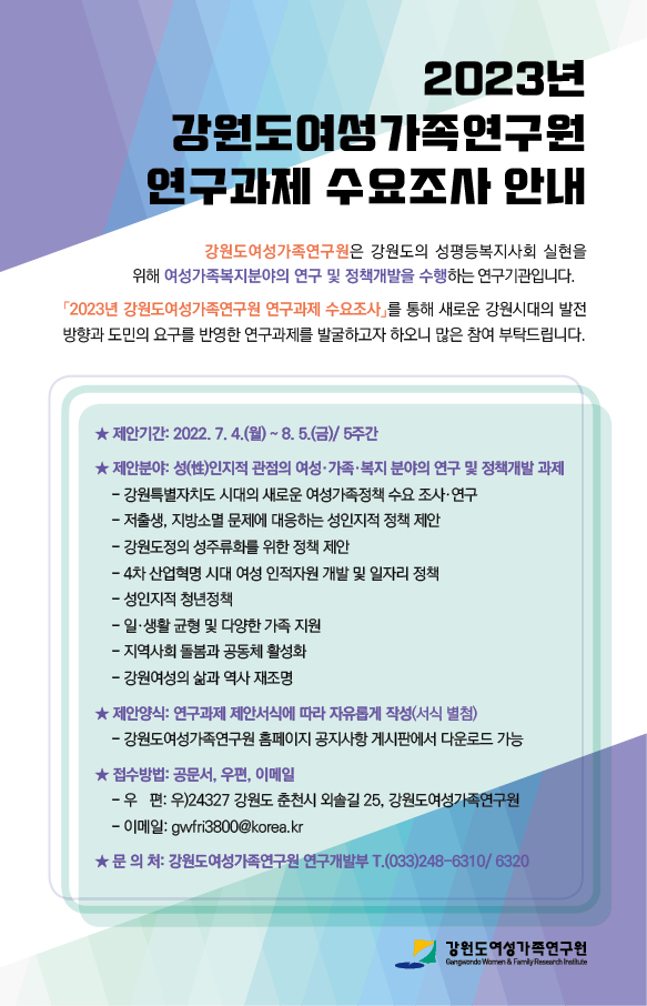 2023년 강원도여성가족연구원  연구과제 수요조사 안내