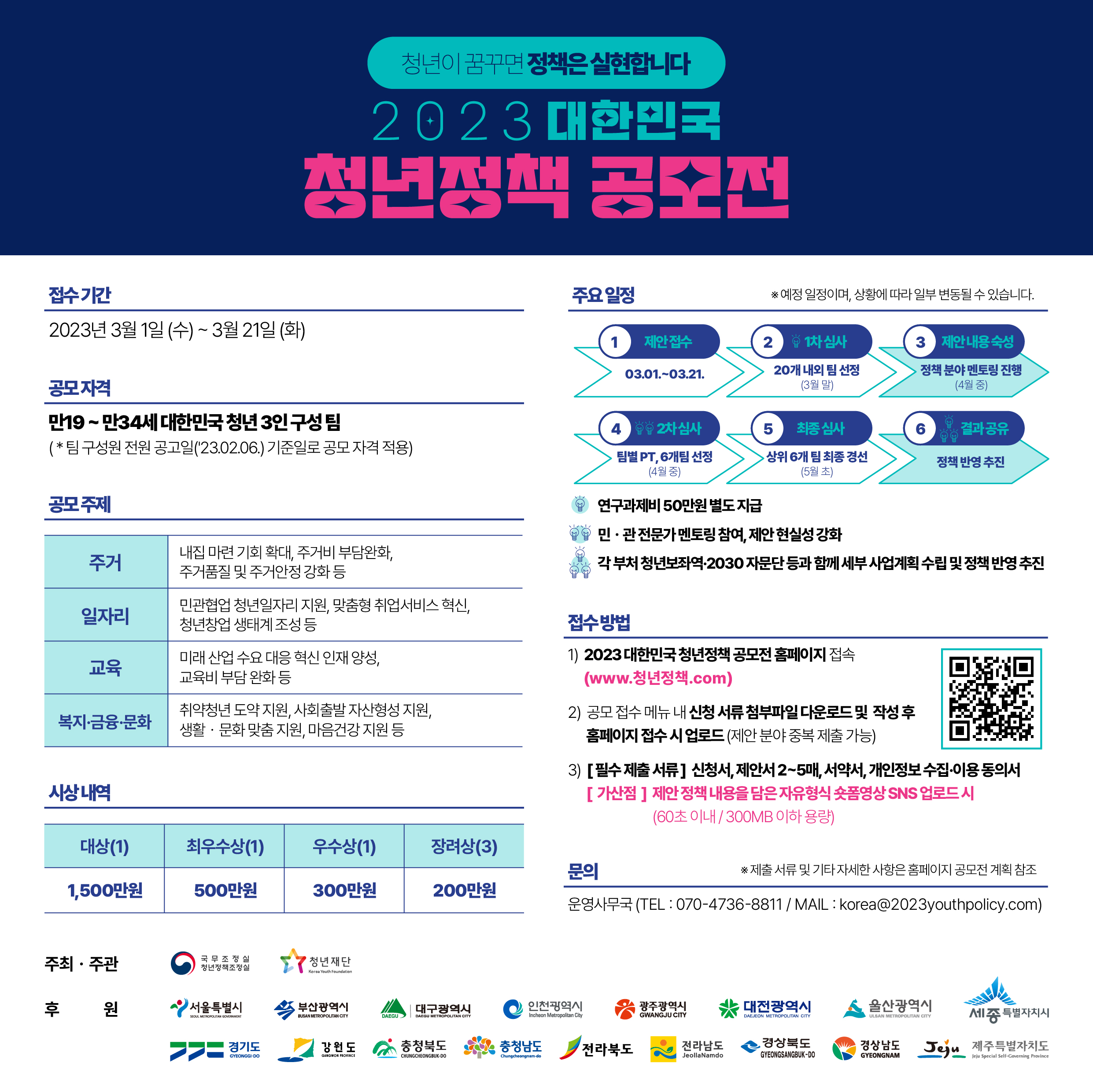 2023년 대한민국 청년정책 공모전 개최를 알려드리오니 청년들의 많은 관심과 참여 바랍니다.