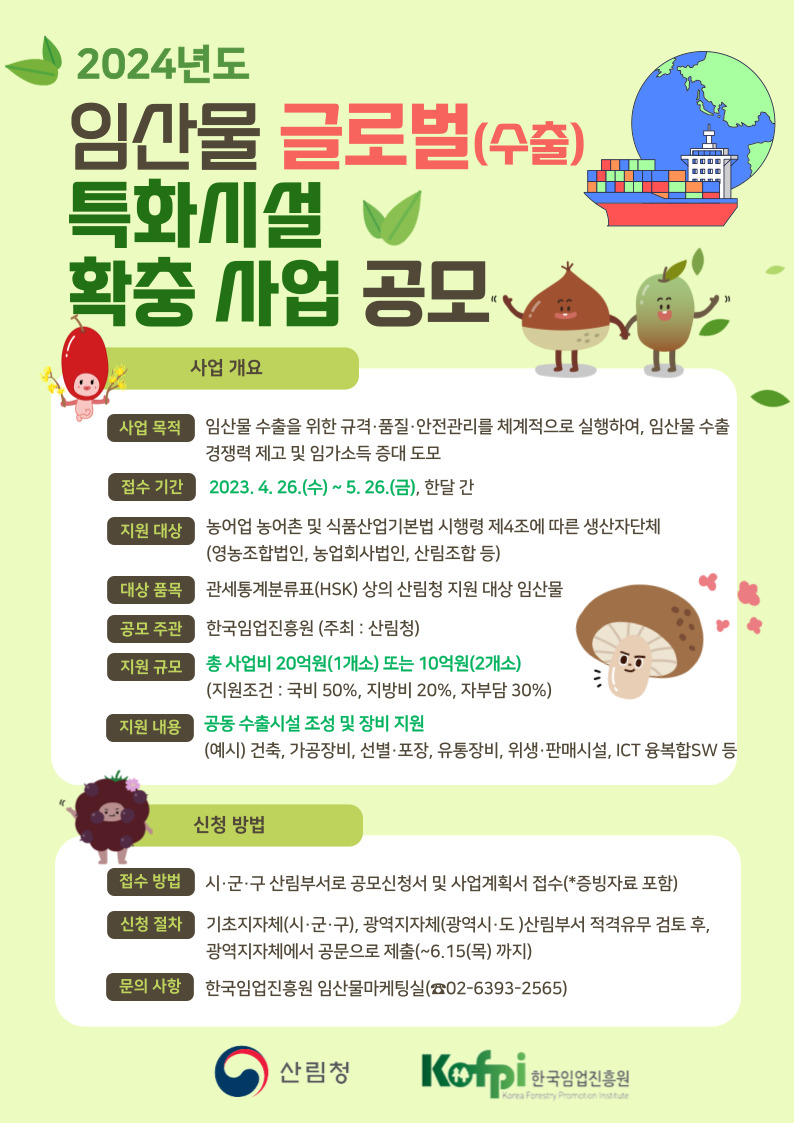 2024년도 임산물 글로벌 특화시설 확충사업 공모 계획 안내드립니다.