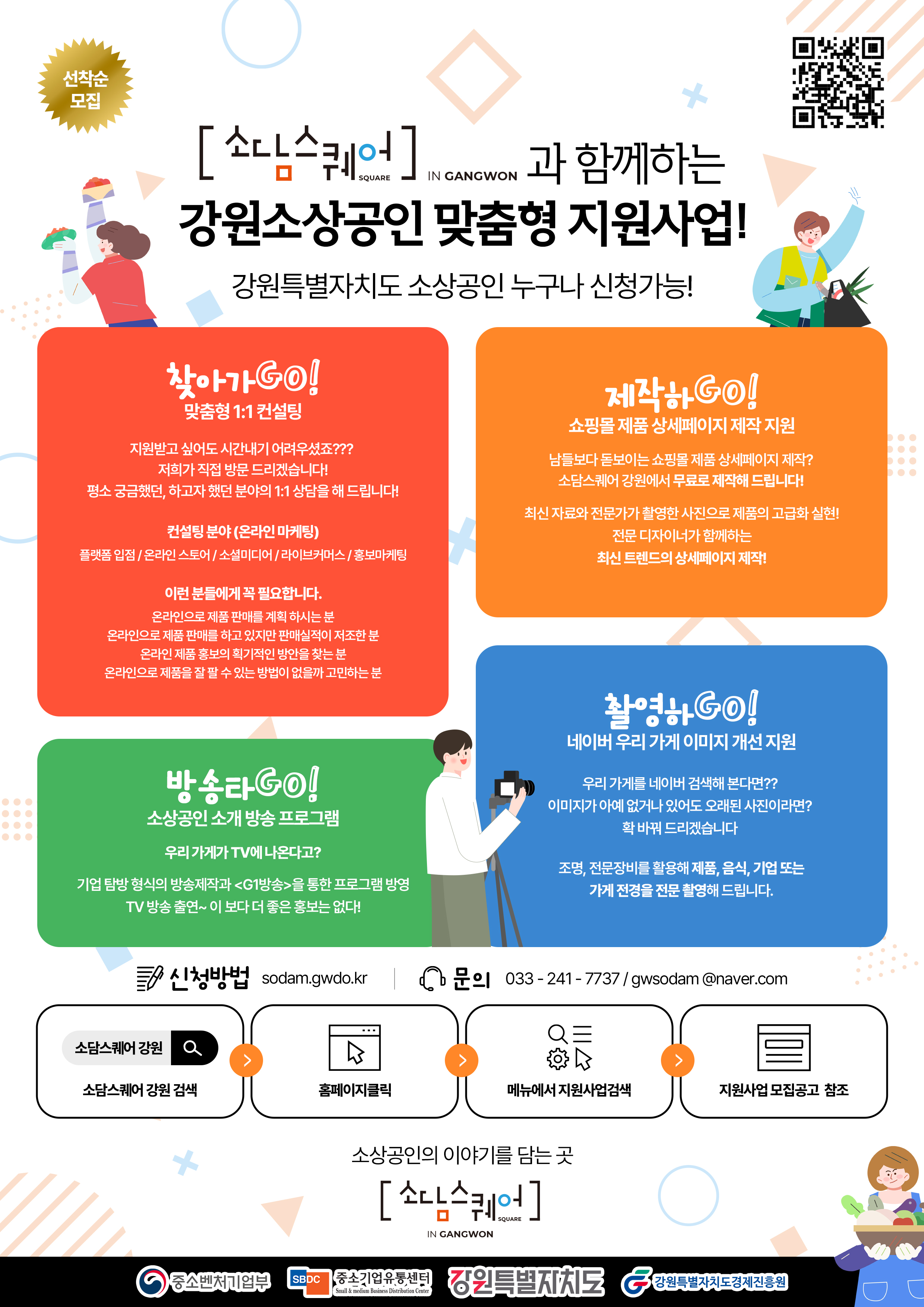 우리 도에서는 소상공인들의 온라인 판로 확대 및 경영활성화를 위하여「소담스퀘어 in 강원」을 운영하고 있으며, 1:1 맞춤형 컨설팅 등 소상공인 지원사업에 참여할 소상공인을 모집 중에 있습니다.