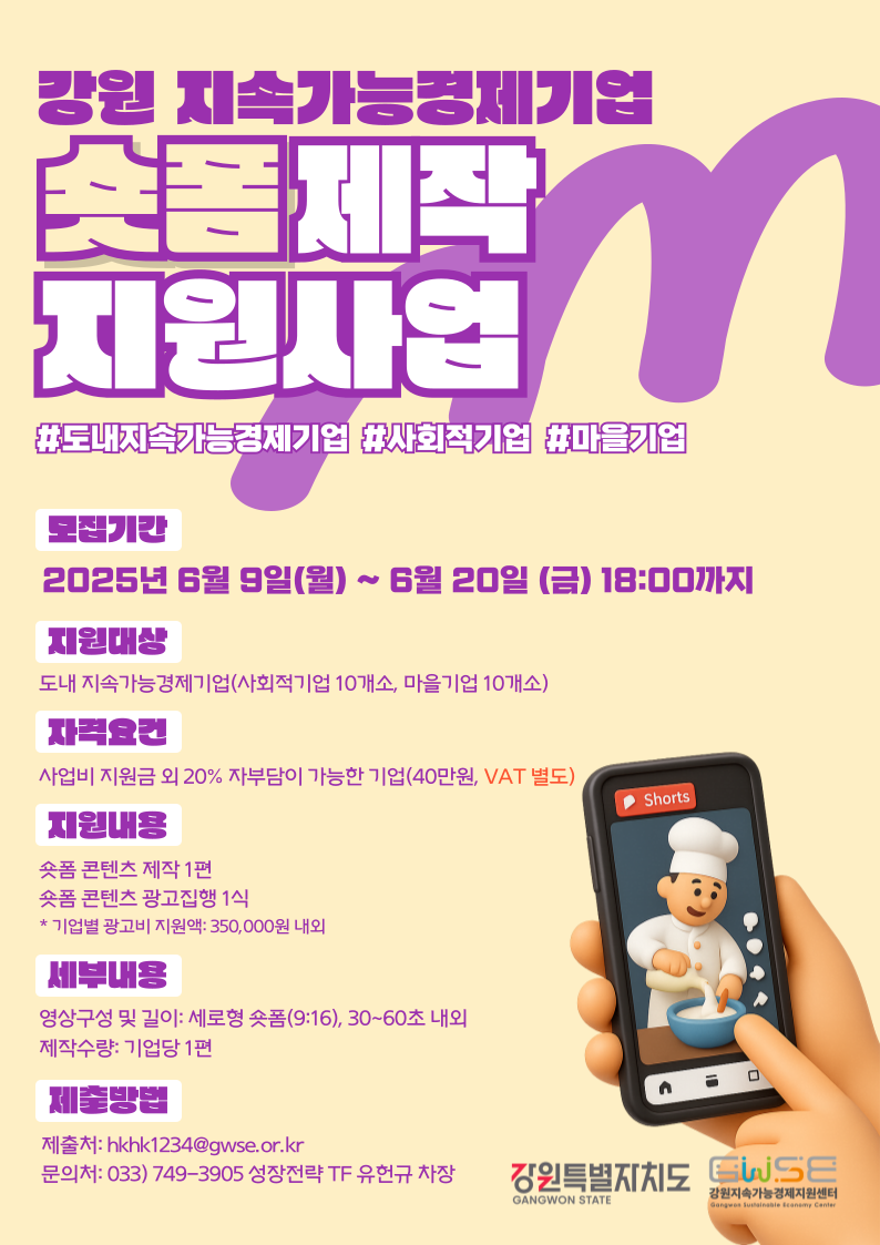강원지속가능경제지원센터는 강원특별자치도 내 지속가능경제기업이 소비로 이어질 수 있는 실효성 높은 숏폼 콘텐츠 제작과 타겟 광고 지원으로 상품 인지도 및 매출 향상을 도모할 수 있는 '강원 지속가능경제기업 숏폼 제작 지원사업' 참여기업을 모집하고 있습니다. 관심 있는 사회적기업 및 마을기업은 신청바랍니다!