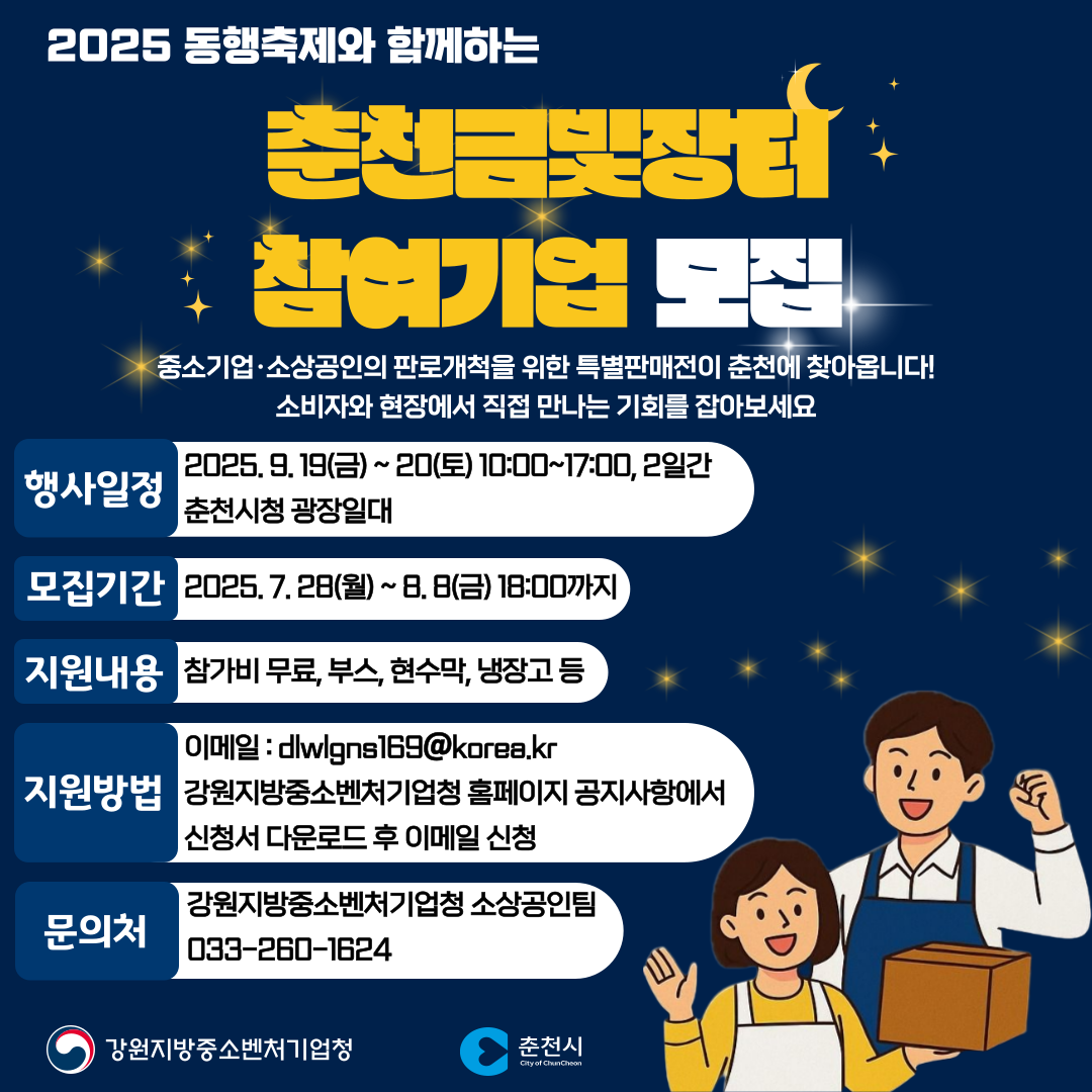 2. 이와 관련, 오는 9월에 도내 우수 중소기업 제품의 특별할인 판매와 다양한 부대행사를 진행하는 '우수 중소기업 제품 판촉전, 춘천금빛장터'를 개최하며 참여기업을 아래와 같이 모집함을 알려드립니다.