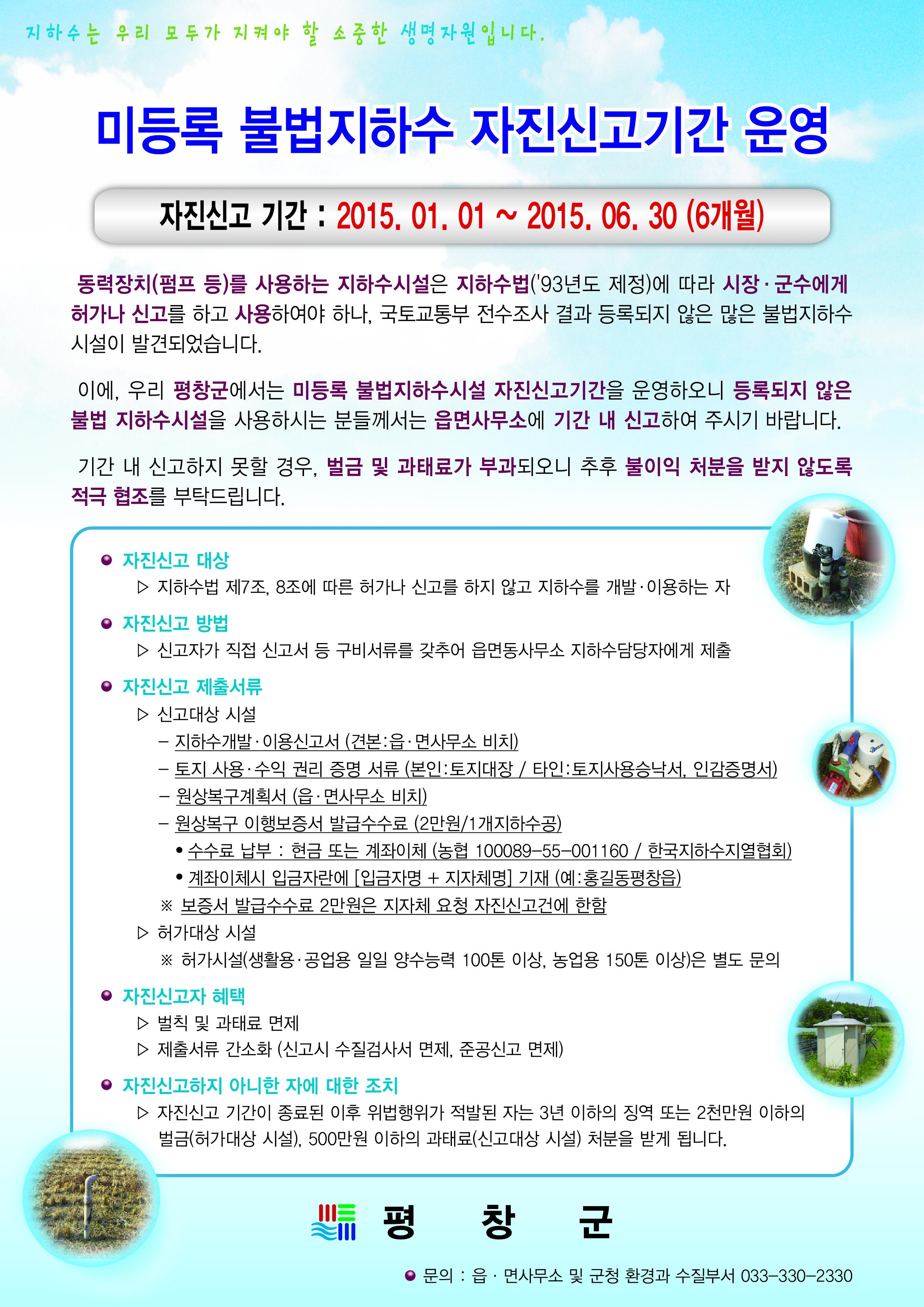 평창군은 2015년 상반기(6월말까지)에 등록하지 않고 사용하시는 지하수에 대하여 등록절차를 이행하고 있습니다.