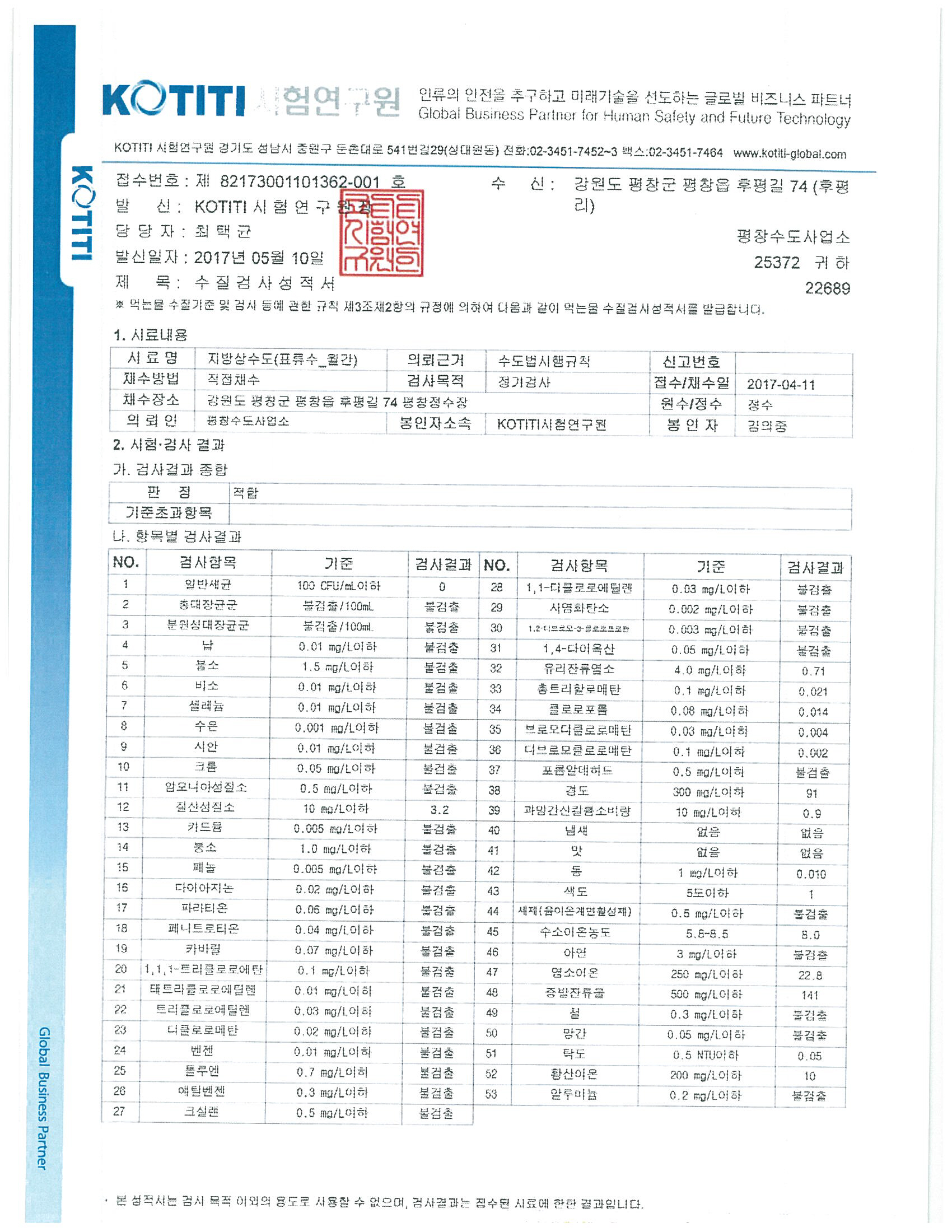2017년 4월 지방상수도 수질검사 결과를 붙임과 같이 알려드립니다.