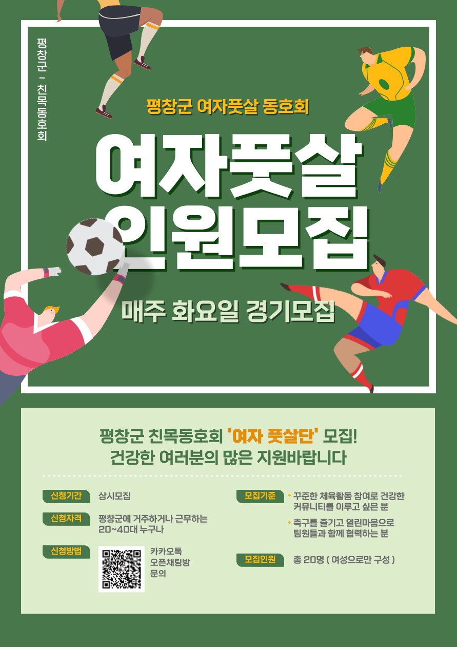 - 신청방법 : - 카카오톡 오픈채팅 " 평창군 여자풋살 모집방" 검색 후 입장 or 첨부된 포스터에 QR코드를 통하시면 됩니다!!