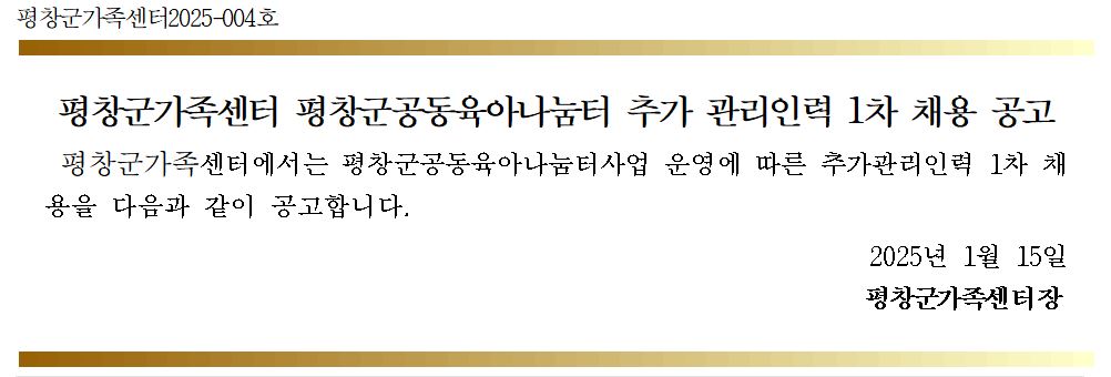 평창군가족센터 평창군공동육아나눔터 추가관리인력 채용 공고