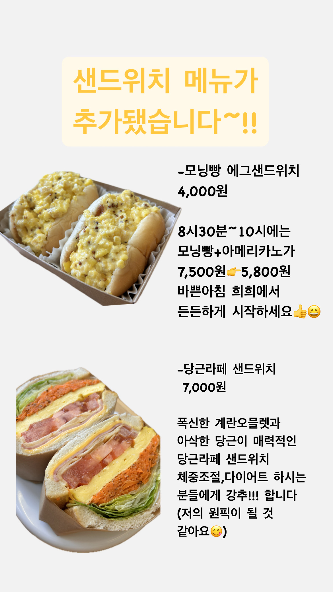 기존에 있던 샌드위치 이외에 모닝빵 에그샌드위치(4,000원)와 당근라페 샌드위치(7,000원)가 추가되었습니다ㅎㅎ