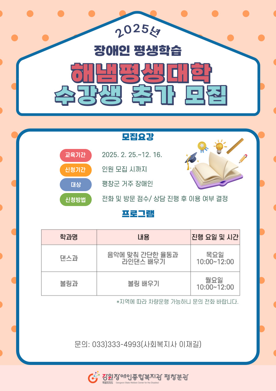 평창군 장애인 평생학습 프로그램 '해냄평생대학' 이용자 추가 모집합니다.
