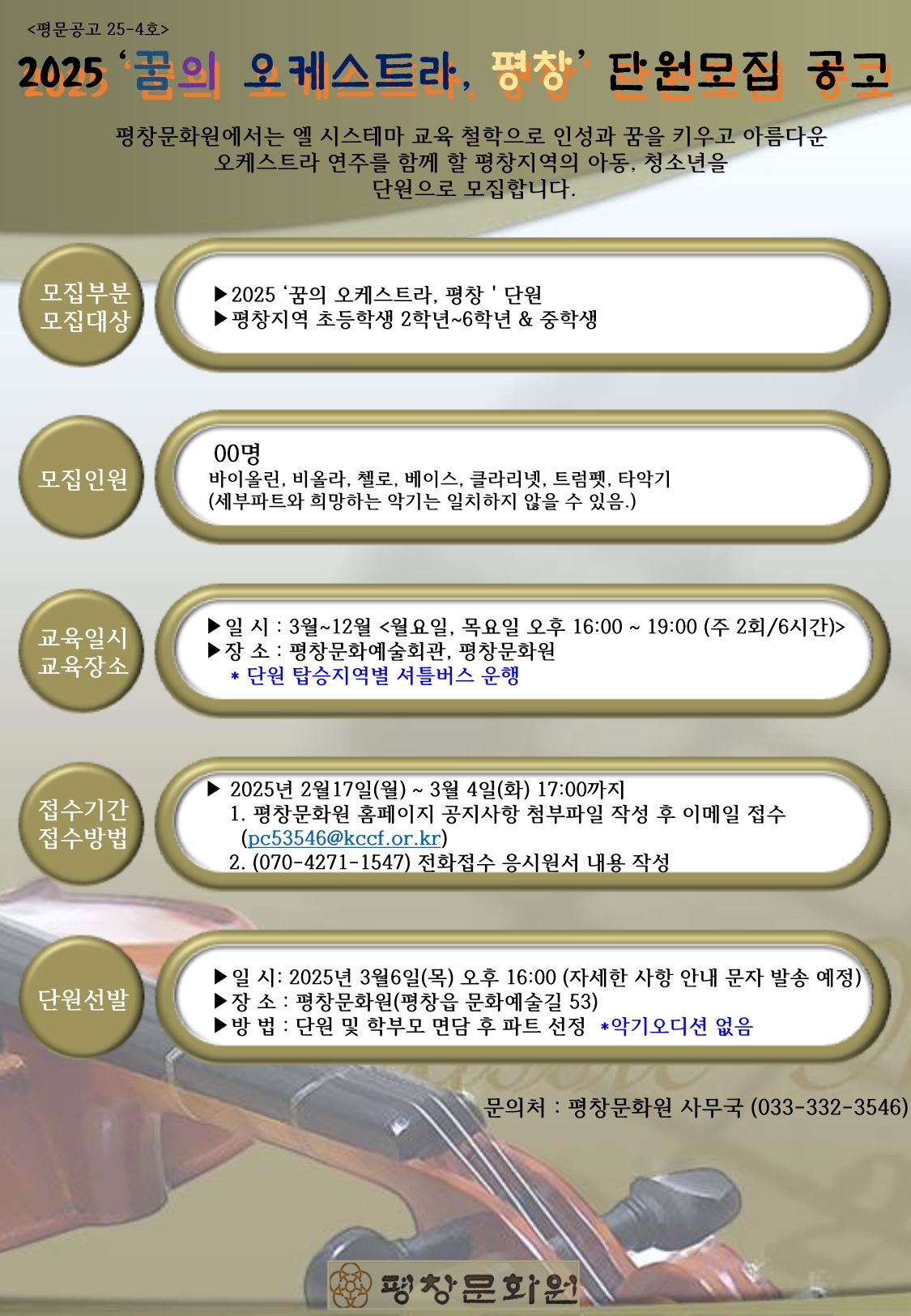 평창문화원에서 2025년도 꿈의 오케스트라, 평창에서 함께 꿈을 키워갈 신입단원을 모집합니다.