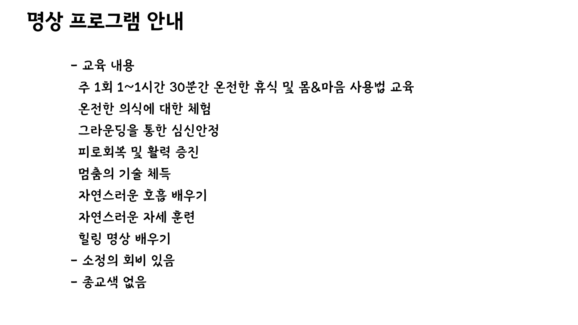 종교적인 색깔은 없으며, 건강하게 나이들어가는 아주 좋은 방법, 알렉산더테크닉을 기반으로 한 명상 프로그램입니다.
