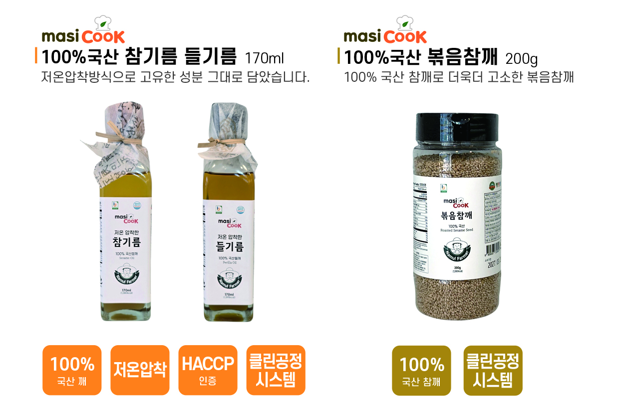 100% 국산깨로 저온압착하여 만든 참기름, 들기름, 볶음참깨가 출시 되어