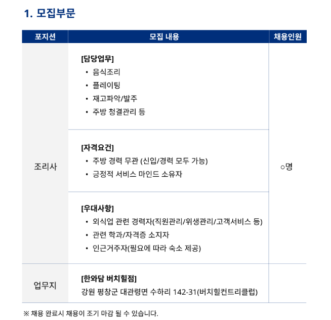 [LIG그룹 직영] (주) LIG홈앤밀 한와담 버치힐 C.C점 조리사 채용