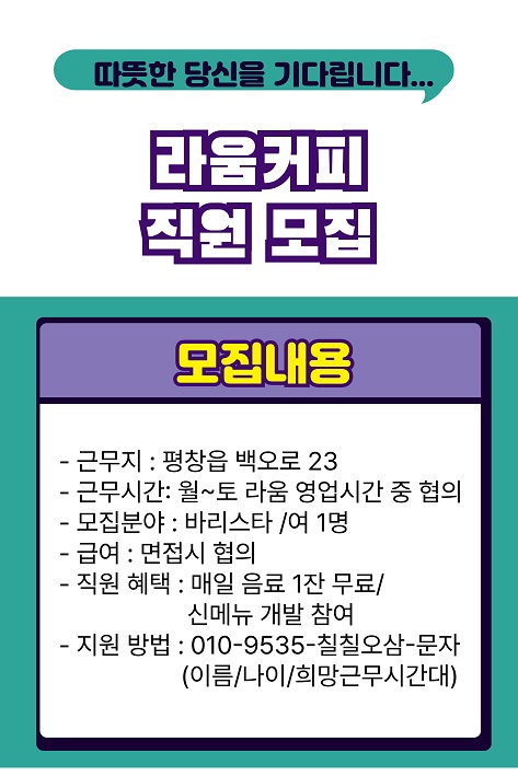 평창읍 라움커피 직원 모집