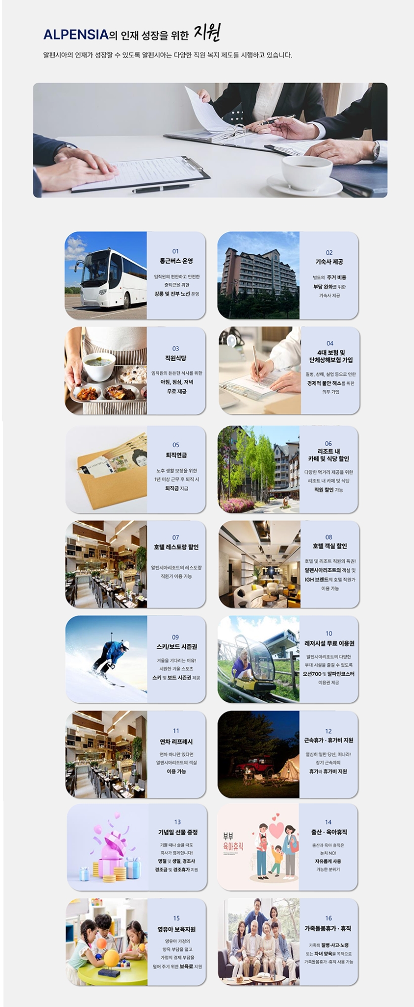 7. 복리후생 : 통근 셔틀버스, 기숙사(3인실) 제공, 근무복 제공, 리조트 시설이용 우대(호텔/콘도, 스키, 워터파크 등), 경조휴가 및 경조비, 명절선물, 건강검진, 기타 퇴직연금 및 연차휴가 등 법에서 정하는 사항 준수