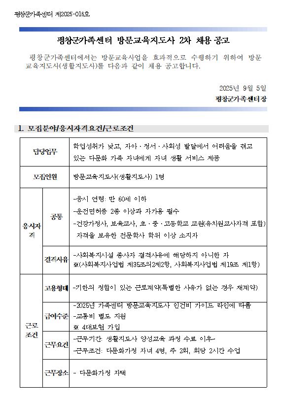 평창군가족센터 방문교육지도사 2차 채용 공고