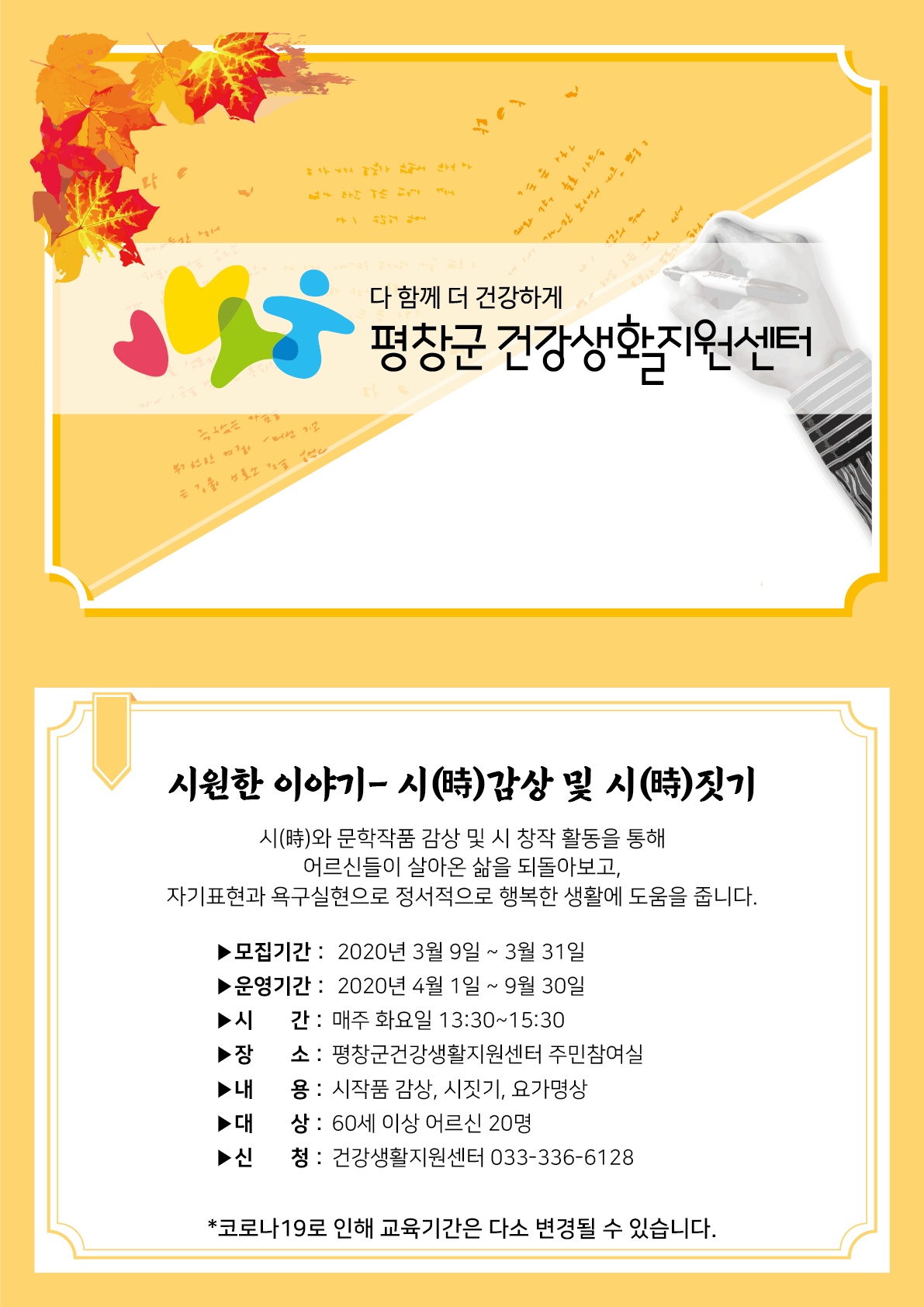 내용 : 건강체험관, 시작품 감상, 시짓기, 요가명상 등